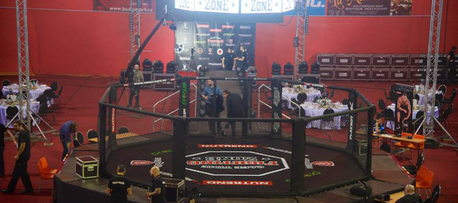 Pro akci FIGHTING ZONE jsme realizovali dočasný potisk plachty klece MMA, který je možné po akci sundat nebo modifikovat pro další akci.